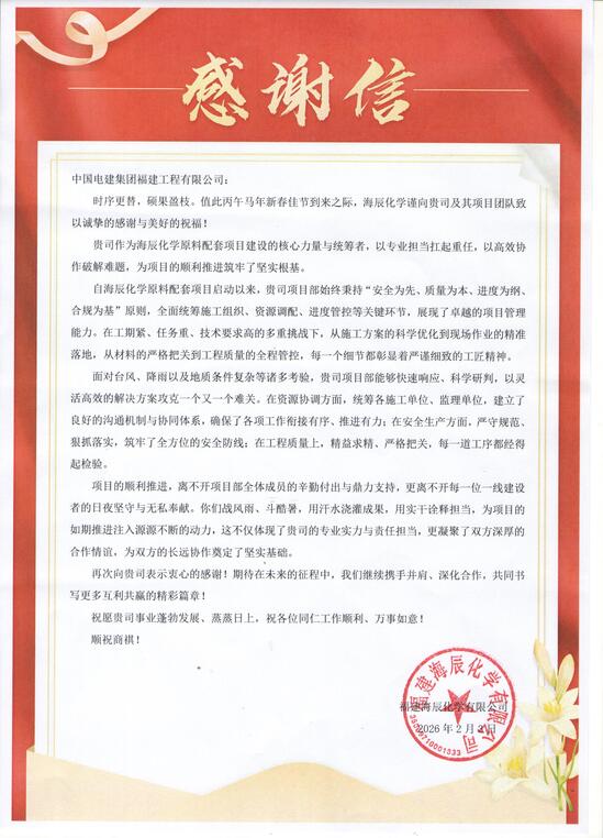 春节将至,岁寒情暖。日前,福建海辰化学有限公司副总经理曲兴韬一行莅临公司开展交流。公司领导苏永强出席座谈。 座谈会上,曲兴韬详细了解了项目进展、现场施工组织与保障情况,并亲切询问了一线员工的工作生活状况。他代表海辰化学对我司在合作中展现的专业能力、高效执行与全力保障表示高度认可与衷心感谢。曲兴韬强调,节日期间要始终把安全生产放在首位,压实安全责任、细化防控举措、强化应急值守,确保人员平安、工程有序,共同度过一个祥和、稳定的春节。 苏永强对福建海辰化学的的到访与信任表示诚挚感谢。他指出,业主的肯定既是鼓励更是鞭策,公司将以此次交流为契机,把信任与关怀转化为持续奋进的动力,坚持质量为本、安全为先,以更高标准、更实作风推进后续工程建设,确保优质高效履约,以实际行动回馈合作伙伴的支持与期待。 |